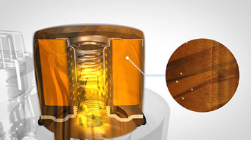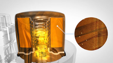 高温に耐え、カーボン質等の微粒子も捕獲するチタン酸カリウム繊維をろ材とし、エンジンオイルのコンディションを整えます。高圧時の濾紙変形を抑制するため、ろ紙裏面にピッチスペーサーネットを内蔵。ろ過機能の安定化を図っています。