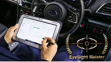 SUBARU独自の先進技術「アイサイト」。その高度なシステムに関する知識と技術を身につけるために設けられた千葉スバル独自の資格、それが「アイサイトマイスター」です。厳しい試験をクリアした84名*の精鋭たちが、「ドライバーモニタリングシステム」をはじめ日々進化する技術を学び、「アイサイト車検」の品質向上に努めています。